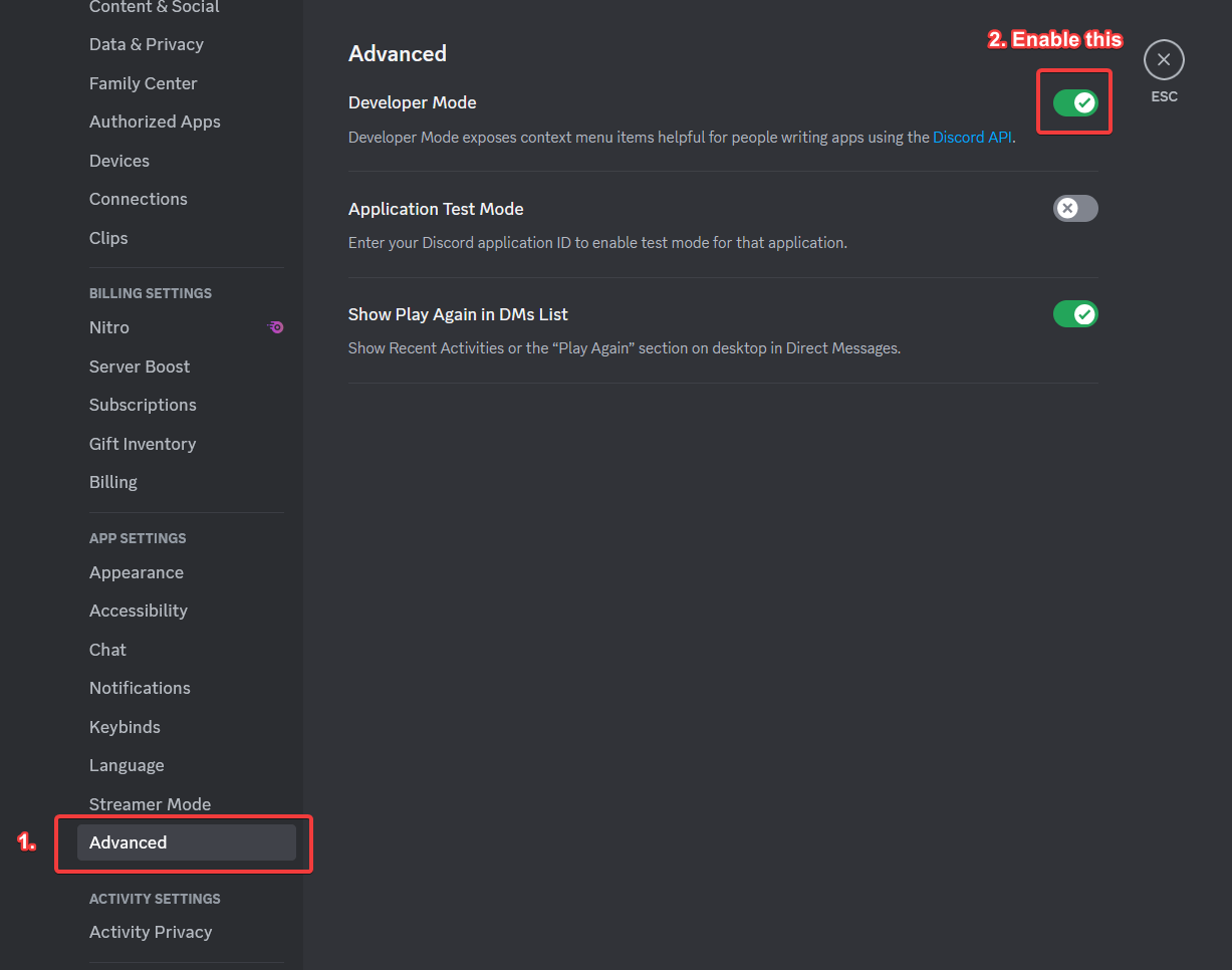Head over to your Discord settings, then Advanced, and then enable Developer Mode.